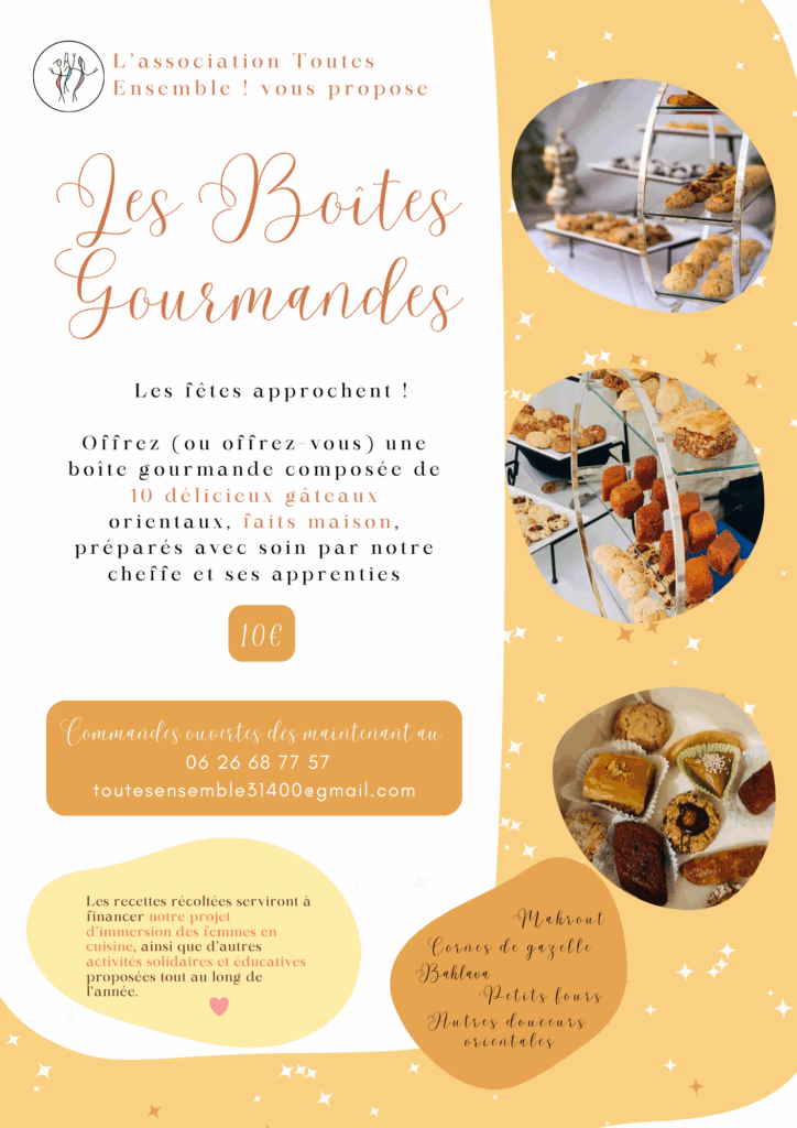 Offrez une boîte gourmande composée de 10 délicieux gâteaux orientaux faits maison, préparés avec soin par notre cheffe et ses apprenties, pour seulement 10 €.